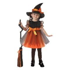 Przebranie dla dziewczynki w kolorach pomarańczowym oraz czarnym. Strój składa się z sukienki z krótkimi rękawami, z tiulowym wykończeniem oraz kapelusza czarownicy. Posiada ozdobne kokardy.