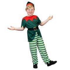 Kostium elfa dla dziecka. W skład zestawu wchodzi czapka, bluzka z kołnierzykiem oraz spodnie i pasek. Zielona czapka obszyta u dołu czerwonym pasem ma wszytą gumkę, co ułatwia dopasowanie. Bluzka jest w kolorze zielonym z czerwonym kołnierzykiem. Spodnie z gumką w pasie są w białe oraz zielone pasy. Czarny pasek posiada plastikową klamrę w złotym kolorze. Pasek zapina się na rzep. Elf to idealny dziecięcy strój na zabawę tematyczną lub świąteczne przedstawienie. Strój w rozmiarze: M (120-130 cm).