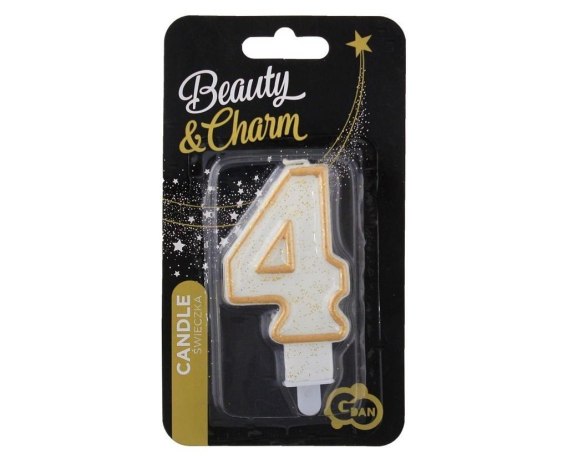 Przepiękna świeczka Cyfra 4 złota to doskonała dekoracja każdego urodzinowego tortu. Świeczka w kształcie cyfry 4 (cztery) ozdobiona złotą brokatową posypką. Dzięki specjalnej stopce, świeczkę łatwo się umieszcza na torcie, dzięki czemu cyfra jest w całości widoczna a dziurka w torcie jest bardzo mała. Dodatkowo stopka zapewnia stabilność świeczki. Idealna ozdoba tortu dla dziecka i osoby dorosłej. Sprawdzi się także na wszelkiego rodzaju rocznicach, firmowych imprezach i wszędzie tam, gdzie z cyfr można ułożyć liczbę lub rok.