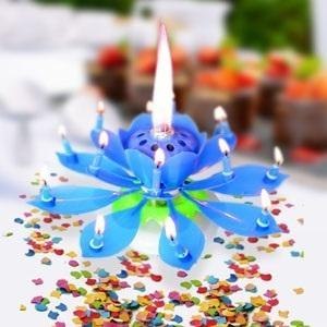 Nietuzinkowa świeczka urodzinowa w kształcie zamkniętego pąku kwiatowego w kolorze niebieskim. Po zapaleniu głównej, środkowej świeczki kwiat otwiera się, kręci oraz gra melodię "Happy Birthday". Na każdym płatku znajdują się małe świeczki, które odpalają się samodzielnie od świeczki głównej dając wyjątkowy efekt wizualny. Świeczka o wysokości 11,5 cm. Szerokość po rozłożeniu płatków około 17 cm. Produkt posiada atest PZH.