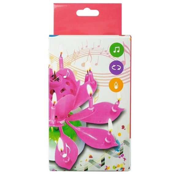 Nietuzinkowa świeczka urodzinowa w kształcie zamkniętego pąku kwiatowego w kolorze niebieskim. Po zapaleniu głównej, środkowej świeczki kwiat otwiera się, kręci oraz gra melodię "Happy Birthday". Na każdym płatku znajdują się małe świeczki, które odpalają się samodzielnie od świeczki głównej dając wyjątkowy efekt wizualny. Świeczka o wysokości 11,5 cm. Szerokość po rozłożeniu płatków około 17 cm. Produkt posiada atest PZH.