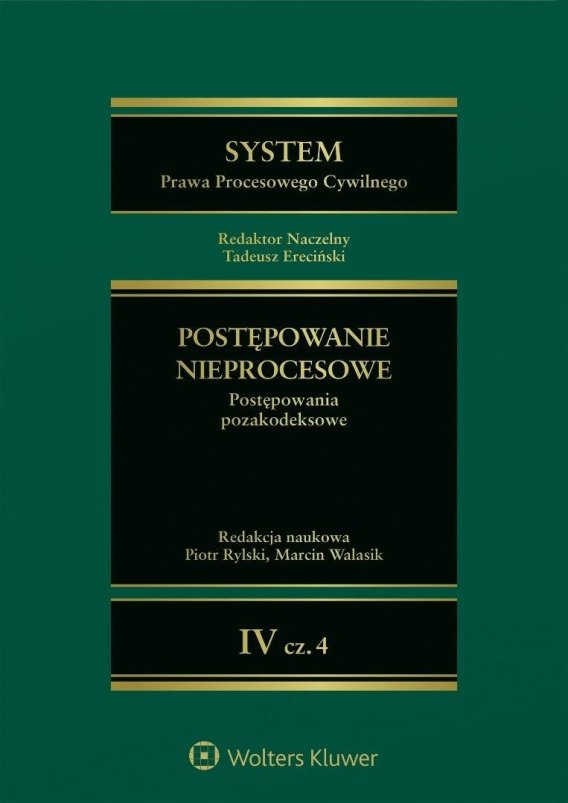 Tom IV Systemu Prawa Procesowego Cywilnego został poświęcony problematyce postępowania nieprocesowego. W 2021 r. ukazała się część 1 tego tomu pod redakcją naukową prof. Tadeusza Erecińskiego oraz prof. Kazimierza Lubińskiego prezentująca zagadnienia ogólne, które odróżniają postępowanie nieprocesowe od procesu. Zagadnienia szczegółowe obejmują postępowania ustanowione dla poszczególnych rodzajów spraw, które są rozpoznawane w trybie nieprocesowym, i są prezentowane w kolejnych częściach tomu IV. Poszczególne postępowania nieprocesowe zostały pogrupowane na podstawie kryterium przedmiotu sprawy. W części 4 podjęto tematykę podstawowych postępowań, które dotyczą spraw skierowanych na drogę postępowania nieprocesowego na mocy ustaw szczególnych. Omówiono postępowania: 1) w sprawach nieletnich, 2) w sprawach wyborczych, 3) w sprawach dotyczących dokumentów, 4) w sprawach z zakresu spółdzielczego prawa mieszkaniowego, 5) w sprawach z zakresu prawa o notariacie, 6) w sprawach z zakresu prawa morskiego 7) o orzeczenie zakazu prowadzenia działalności gospodarczej, 8) w innych sprawach: ze skargi na odmowę przyjęcia zawiadomienia o utworzeniu komitetu inicjatywy ustawodawczej, dotyczące wyborów do rady powiatowej izby rolniczej, postępowania z ustawy o własności lokali, o rozstrzygnięcie w ramach zarządu nieruchomością wspólną w razie braku zgody większości właścicieli lokali, o przyznanie państwowej kompensaty przysługującej ofiarom niektórych czynów zabronionych, wobec osób z zaburzeniami psychicznymi stwarzających zagrożenie życia, zdrowia lub wolności seksualnej innych osób. Tom IV część 4 Systemu Prawa Procesowego Cywilnego pod tytułem "Postępowanie nieprocesowe. Postępowania pozakodeksowe" pod redakcją naukową Piotra Rylskiego i Marcina Walasika jest opracowaniem zbiorowym przygotowanym przez autorów reprezentujących różne ośrodki naukowe i instytucje w Polsce. Przejrzysty układ, najwyższy poziom merytoryczny i edytorski dzieła z pewnością sprawią, że publikacja będzie stanowić nieocenioną pomoc przede wszystkim dla prawników praktyków: sędziów, referendarzy sądowych, adwokatów, radców prawnych, notariuszy, komorników sądowych.