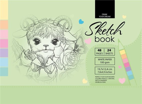Szkicownik 197x124 mm, 48 stron, gramatura papieru 100g/m2. Ołówki, kredki, markery, mazaki, pędzle - tych rzeczy możesz użyć w tym szkicowniku! Namaluj swoje marzenia!