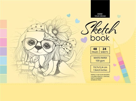 Szkicownik 197x124 mm, 48 stron, gramatura papieru 100g/m2. Ołówki, kredki, markery, mazaki, pędzle - tych rzeczy możesz użyć w tym szkicowniku! Namaluj swoje marzenia!