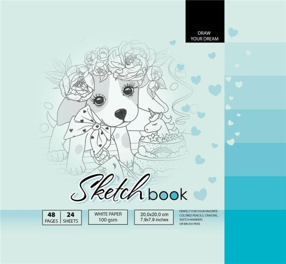Szkicownik 200x200 mm, 48 stron, gramatura papieru 100g/m2. Ołówki, kredki, markery, mazaki, pędzle - tych rzeczy możesz użyć w tym szkicowniku! Namaluj swoje marzenia!