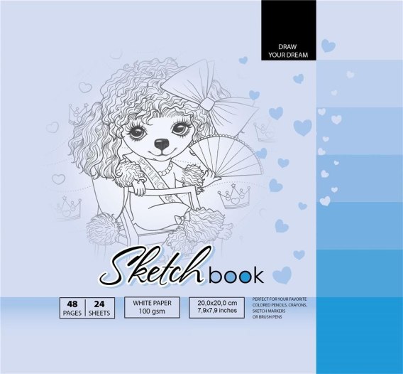 Szkicownik 200x200 mm, 48 stron, gramatura papieru 100g/m2. Ołówki, kredki, markery, mazaki, pędzle - tych rzeczy możesz użyć w tym szkicowniku! Namaluj swoje marzenia!