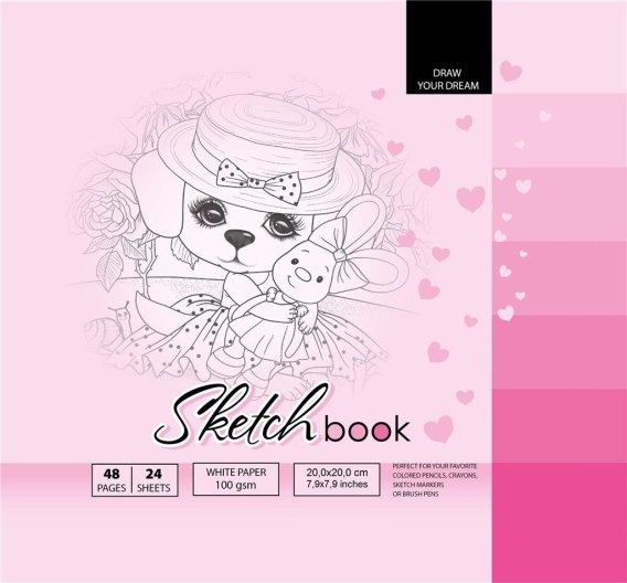 Szkicownik 200x200 mm, 48 stron, gramatura papieru 100g/m2. Ołówki, kredki, markery, mazaki, pędzle - tych rzeczy możesz użyć w tym szkicowniku! Namaluj swoje marzenia!