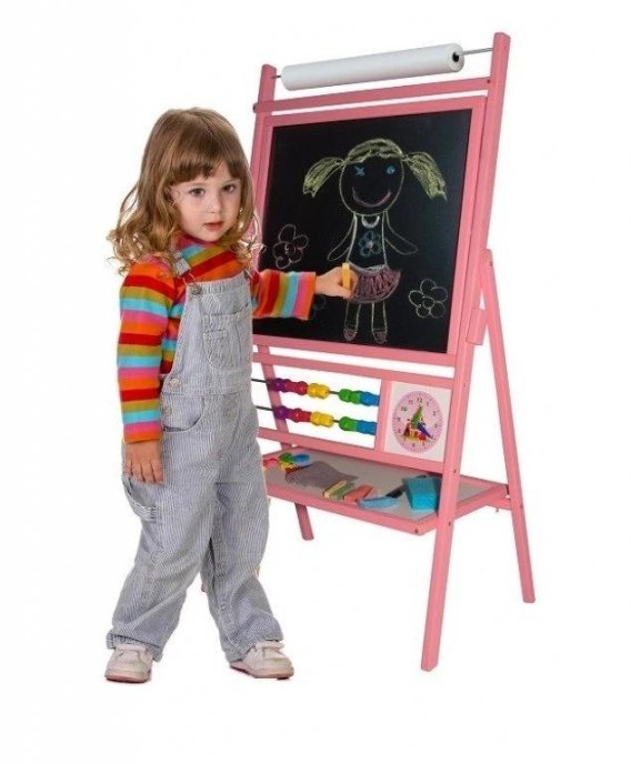 Obrotowa, RÓŻOWA, suchościeralno-kredowo-magnetyczna tablica z 2-rzędowym liczydłem i ROLKĄ papieru do rysowania, zegar z motywem księżniczki z ruchomymi wskazówkami. Wyposażona w gąbkę i kredę. Marker w zestawie.