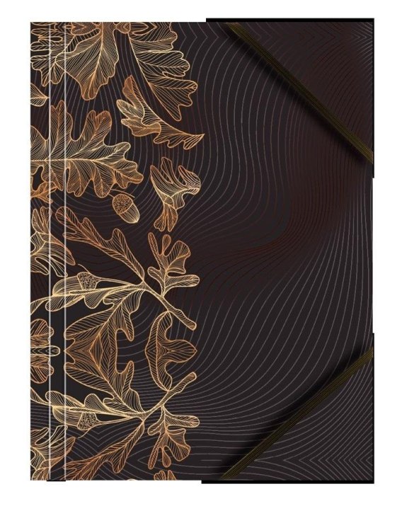 Teczka kartonowa z grafiką i gumką narożną, lakierowana, format A4. Jedna grafika - liście złote. Gramatura: 350g. Rozmiar: 320mm/240mm