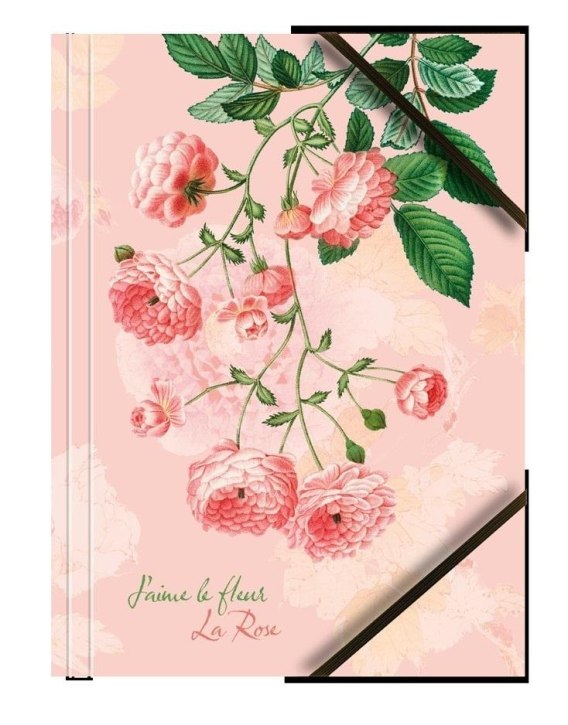 Teczka kartonowa z grafiką i gumką narożną, lakierowana, format A4. Jedna grafika róże na różowym tle. Gramatura: 350g. Rozmiar: 320mm/240mm
