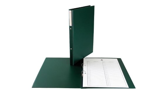 Teczka wykonana z wytrzymałej folii PVC, wewnątrz usztywniona tekturą. Wewnątrz zamontowano mechanizm na 2 ringi umożliwiający wpięcie dokumentów. Wyposażona w uniwersalne, papierowe przekładki A, B, C, D, E bez opisu kategorii. Szerokość grzbietu: 3 cm. Na grzbiecie kieszeń z etykietą do opisu zawartości.
