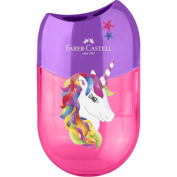 Temperówka podwójna owalna Faber-Castell z serii Jednorożec. Idealna do szkoły. Przeznaczona do klasycznych i trójkątnych kredek i ołówków w standardowym rozmiarze i Jumbo. Ze śrubką zabezpieczającą.
