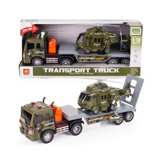 Tir z naczepą to zabawka posiadająca liczne funkcje. Ciągnik siodłowy wyposażony został w napęd frykcyjny - wystarczy pchnąć pojazd w przód, a on przejedzie koleje długości samodzielnie. Dodatkowo, na dachu kabiny znajdują się 4 przyciski, które uruchamiają efekty świetlne i dźwiękowe: dźwięk odpalania, klakson, silnik i cofanie. Twoje dziecko poczuje się, jakby naprawdę prowadziło ciężarówkę, transportując helikopter na miejsce akcji. Dodatkowo pojazdy posiadają gumowe obręcze kół, dzięki czemu nie ślizgają się po podłodze. Dodatkowe atrakcje które zapewnia pojazd to możliwość spinania i rozpinana ciągnika od naczepy oraz ruchoma opuszczana rampa załadunkowa z tyłu naczepy. Natomiast na helikopterze umieszczona została ruchoma wciągarka z hakiem, która umożliwia w ciąganie noszy z poszkodowanymi.