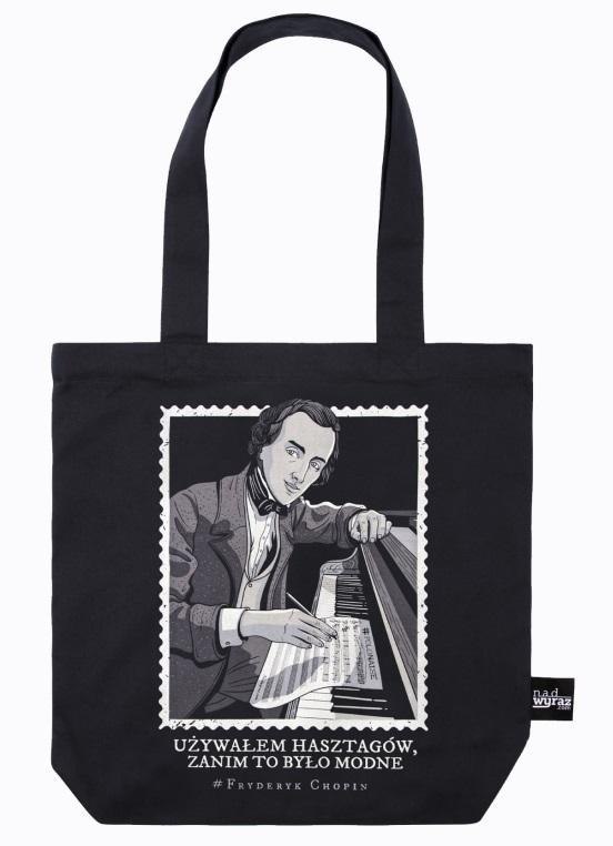 On ma osobny styl, osobną formę, czarujący wdzięk, jakieś nowe, ze sfer wyższych, a może i najwyższych - czerpane modulacje. Słowem, posiada to wszystko, czego przed nim nikt w swych dziełach ani nie okazał, ani nie zamarzył. Ignacy Feliks Dobrzyński Poeta fortepianu - tak nazywano Fryderyka Chopina. Jeden z najwybitniejszych kompozytorów romantycznych, geniusz wielu talentów, lubiany w towarzystwie, siejący postrach wśród uczniów, używający hasztagów, zanim to było modne. Tej postaci po prostu nie mogło zabraknąć na naszej torbie z kolekcji ROMANTYZM, którą stworzyliśmy z okazji ustanowionego decyzją sejmu RP Roku Romantyzmu Polskiego. Torba FRYDERYK CHOPIN powstała we współpracy z Narodowym Instytutem Fryderyka Chopina. To idealny prezent dla pianisty i miłośnika muzyki klasycznej, a zwłaszcza twórczości tego wielkiego kompozytora. Licencja: Narodowy Instytut Fryderyka Chopina Gramatura 280 g/m Nadruk wykonany metodą sitodruku (wysokiej jakości, bardzo trwały) 100% bawełna, torba ekologiczna Licencja: Narodowy Instytut Fryderyka Chopina Elegancka metka boczna W środku torby pojemna kieszonka na akcesoria Wymiary: 45 x 41 x 9 cm, ucho: 64 x 3,5 cm. Prać w niskiej temperaturze, prasować na lewej stronie, nie czyścić chemicznie