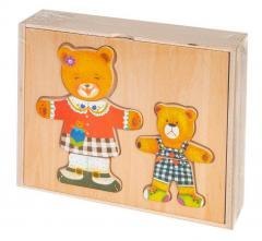 Drewniana układanka to 2 wesołe misie do układania. Można zmienić im nastrój lub ubranie. Wszystkie elementy umieszczone są w drewnianym pudełku, co ułatwia utrzymanie zabawki w porządku po skończonej zabawie. Pudełko ma również funkcję formy na której układamy odpowiednie elementy.