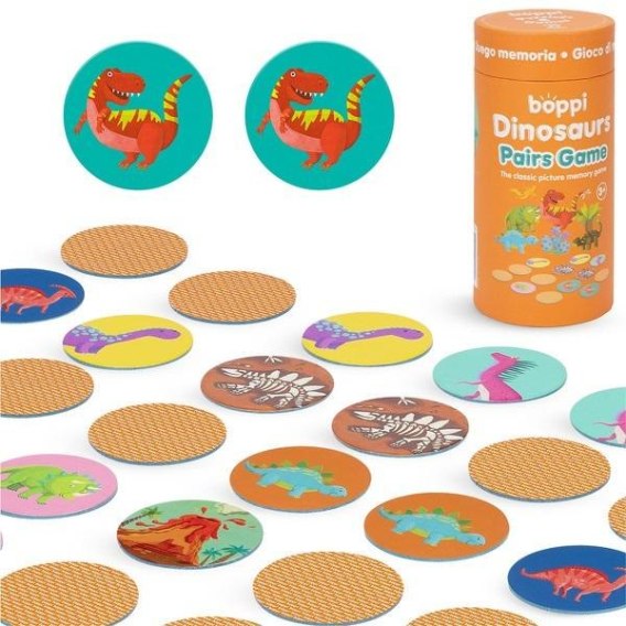 Boppi, układanka w pary memo Dinozaury to wspaniała, edukacyjna gra memo. Super sprawdzi się także w podróży. Gra ćwiczy koncentrację i pamięć oraz logiczne myślenie. Dzieci muszą starać się zapamiętać gdzie były odkładane karty z ilustracjami dinozaurów, aby potem jak najszybciej znaleźć właściwą parę.