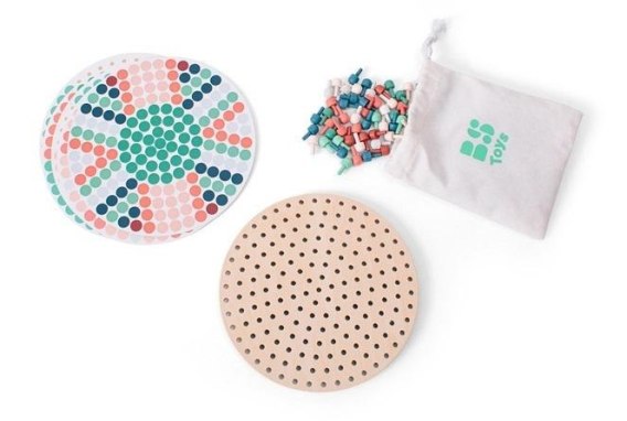 Zestaw zawiera: 1 x drewniana deska z otworkami o średnicy 19 cm, 217 drewnianych pinezek 1x2 cm, 6 kart z 12 wzorami, bawełniany woreczek do przechowywania