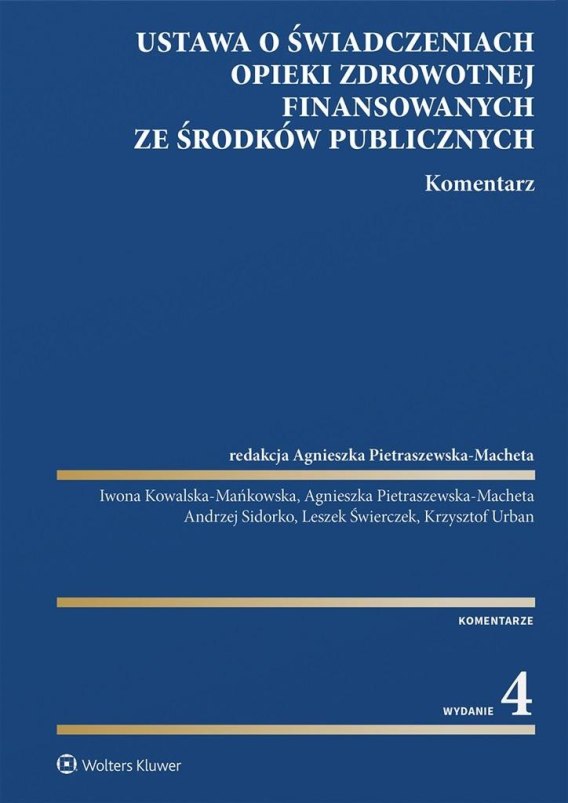 Publikacja w sposób przystępny omawia najważniejszą ustawę określającą zasady funkcjonowania systemu opieki zdrowotnej w Polsce. Książę opracowali prawnicy praktycy, w tym również pracujący od wielu lat w Narodowym Funduszu Zdrowia, na co dzień stykający się z problemami finansowania świadczeń ze środków publicznych. W czwartym wydaniu omówiono ostatnie zmiany w systemie ochrony zdrowia, w tym m.in.: - nowe zasady dotyczące centralizacji procesu kontroli w zarządzaniu Narodowym Funduszem Zdrowia; - utworzenia Funduszu Medycznego w celu finansowania świadczeń opieki zdrowotnej; - zmiany w organizacji Narodowego Funduszu Zdrowia dotyczące modyfikacji systemu opracowania i wdrażania map potrzeb zdrowotnych oraz odnoszące się do systemu finansowania świadczeń opieki zdrowotnej. Oprócz przedstawienia poglądów, zaprezentowano praktyczne rozwiązania dotyczące zastosowania przepisów komentowanej ustawy w praktyce, jak również bogaty wybór literatury i orzecznictwa sądów powszechnych i administracyjnych. Książka jest przeznaczona dla pracowników oraz właścicieli podmiotów leczniczych publicznych i niepublicznych. Ponadto może stanowić cenną lekturę dla pracowników Narodowego Funduszu Zdrowia. Zainteresuje również sędziów, radców prawnych i adwokatów.