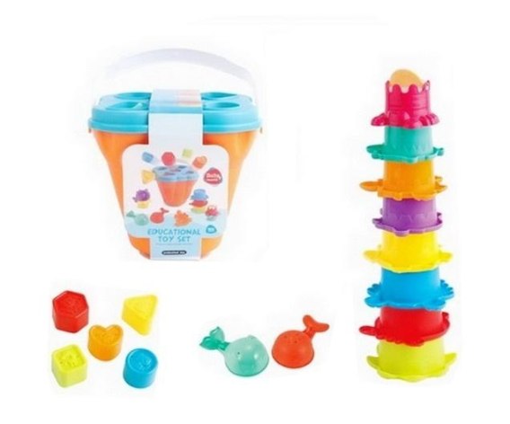Wiaderko sorter, które kryje w swoim wnętrzu klocki w różnych kształtach i kolorach. Zabawka stymuluje u dzieci rozwój zmysłów, ćwiczy zręczność paluszków. Z elementów można układać piramidkę. W zestawie 16 elementów. Produkt przeznaczony dla dzieci od 18 miesiąca życia. Cena dotyczy jednej sztuki.