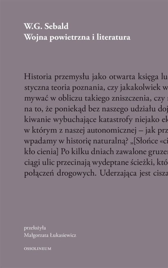 Wojna powietrzna i literatura jest żarliwą krytyką kultury powojennych Niemiec i jej niezdolności do żałoby. To książka, w której W.G. Sebald jawi się jako nieprzejednany polemista bezkompromisowy w sądach, kategoryczny w tonie. Narracyjna subtelność, tak charakterystyczna dla jego prozy fikcjonalnej, ustępuje tu postawie oskarżycielskiej. J'Accuse! rezonuje w niniejszym tomie na wielu poziomach, sięga bowiem do samych fundamentów oświeceniowego humanizmu, a także do etycznych powinności literatury.