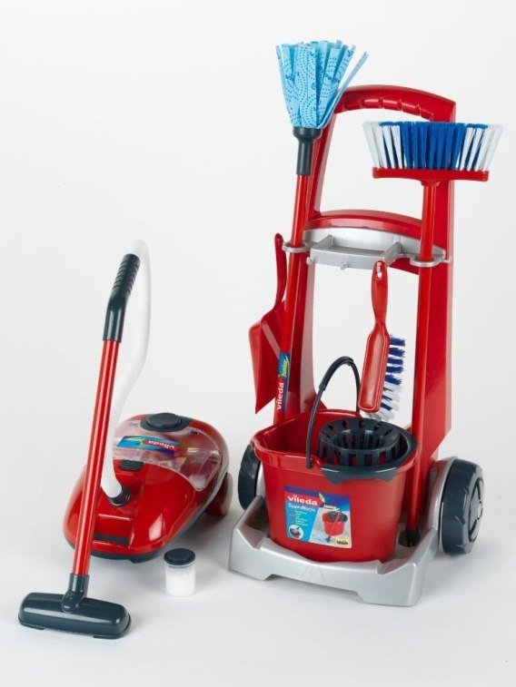 Zestaw z wózkiem do sprzątania i odkurzaczem jest jednym z najbogatszych zestawów w tej serii. Oprócz standardowych akcesoriów do sprzątania, takich jak zmiotka z szufelką i miotła, zawiera także wyglądające zupełnie jak prawdziwe wiadro z wyciskaczem oraz mopa paskowego. Wszystkie te elementy mogą na prawdę zostać użyte do sprzątania.