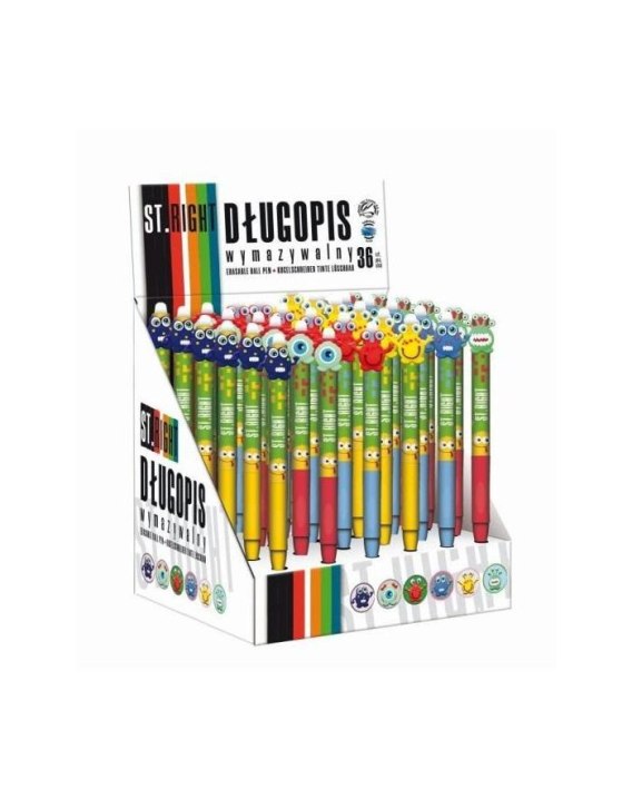 Wymazywalny niebieski tusz, cienka końcówka pisząca 0,5 mm umożliwiająca precyzyjne pisanie. Anatomicznie profilowany gumowy, antypoślizgowy grip zapewniający komfortowy chwyt i wygodne prowadzenie długopisu po kartce. Specjalna końcówka ścierająca w połączeniu ze specjalistycznym tuszem umożliwia łatwe wymazywanie napisanego tekstu, czy skorygowanie błędu. Gadżeciarski charakter długopisu sprawia, że pisanie jest nie tylko nauką, ale dobrą zabawą i czystą przyjemnością.