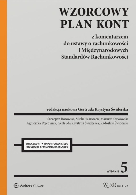 Opracowanie zawiera wykaz kont dla jednostek stosujących ustawę o rachunkowości oraz wykaz kont dla jednostek stosujących Międzynarodowe Standardy Sprawozdawczości Finansowej. W obszernym komentarzu do każdego zespołu kont przedstawiono definicje, podstawowe pojęcia, zasady wyceny wraz z omówieniem różnic między MSSF/MSR a ustawą o rachunkowości. Publikacja zawiera wiele przykładów ilustrujących szczególnie trudne zagadnienia. Główne części publikacji to: wykaz kont syntetycznych w zakresie, który pozwala ująć wszystkie zdarzenia w sposób umożliwiający sporządzenie sprawozdania finansowego w kształcie wymaganym przez ustawę o rachunkowości oraz Międzynarodowe Standardy Sprawozdawczości Finansowej; komentarz do każdego zespołu kont obejmujących część wprowadzającą oraz szczegółowe wyjaśnienia do poszczególnych kont; szczegółowe wyjaśnienia dla każdego konta syntetycznego z typowymi zapisami księgowymi i wskazaniami do rozwinięcia analitycznego zapewniającego spełnienie wymagań związanych ze sporządzaniem bilansu (w tym informacji dodatkowej), klasyfikacji GUS, rozrachunku z budżetem; procedury sporządzania bilansu oraz rachunku zysków i strat na podstawie zawartego w opracowaniu planu kont. W obecnym wydaniu uwzględniono zmiany związane z aktualizacją przepisów ustawy o rachunkowości oraz dyrektyw Parlamentu Europejskiego i Rady dotyczących sprawozdawczości w zakresie zrównoważonego rozwoju (ESG). Uzupełniono konta o znaczniki wynikające z faktu, że podatnicy będą zobowiązani do przesyłania zestawu elektronicznych danych do organów skarbowych w formie jednolitego pliku kontrolnego JPK_ KR_PD. Omówiono również obowiązki sprawozdawcze inne niż sprawozdanie finansowe, czyli sprawozdanie z działalności obejmujące sprawozdawczość zrównoważonego rozwoju, sprawozdanie z płatności na rzecz administracji publicznej i sprawozdanie o podatku dochodowym. Wzorcowy plan kont został przygotowany przez zespół ekspertów łączących doświadczenie praktyczne z dorobkiem naukowym oraz uczestnictwem w pracach legislacyjnych nad prawem finansowym. Publikacja adresowana jest do jednostek prowadzących zarobkową działalność wytwórczą, usługową i handlową, stosujących ustawę o rachunkowości oraz jednostek, które stosują lub zamierzają stosować Międzynarodowe Standardy Rachunkowości, Międzynarodowe Standardy Sprawozdawczości Finansowej oraz związane z nimi interpretacje ogłoszone w formie rozporządzeń Komisji Europejskiej, zwanymi dalej "MSR".