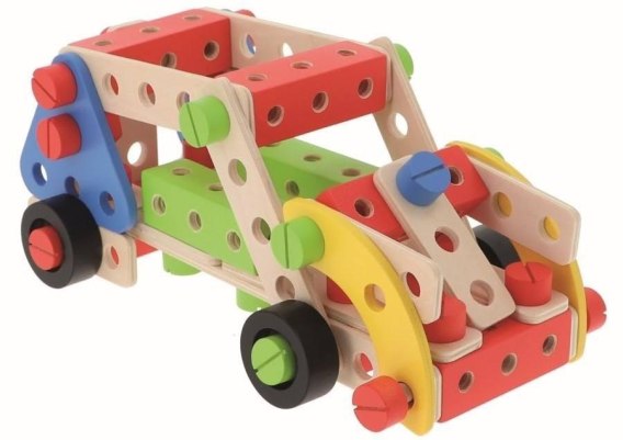 W zestawie aż 95 elementów: klocki, śrubki i narzędzia oraz manual z propozycjami złożenia wielu różnorodnych konstrukcji.
