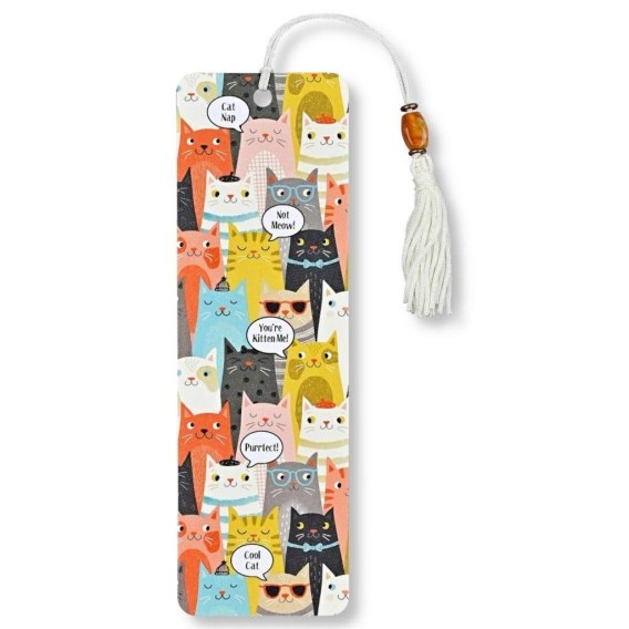 Zakładka do książki firmy Peter Pauper Press - Koty (Cats). Zakładka ma dopasowaną kolorystycznie wstążkę z frędzlem oraz koralik. Barwne, trwałe, zabawne lub motywujące nadruki sprawią, że czytanie będzie jeszcze ciekawsze. Każda zakładka jest drukowana na trwałym, powlekanym kartonie i pakowana w przezroczystą osłonkę. Uniwersalny wymiar 6,4 x 18,1 cm.