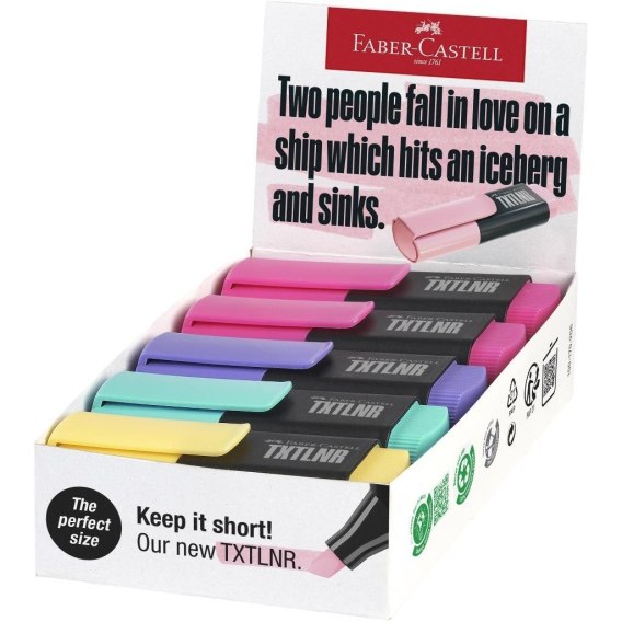 Display z zakreślaczami min TXTLNR Faber-Castell 10 szt. mix kolorów pastelowych od Faber-Castell. Wysokiej jakości pastelowe kolory, idealne do zaznaczania, podkreślania i wyróżniania. Odpowiednie do wszystkich rodzajów papierów. Uniwersalny tusz na bazie wody. Odporne na rozmazywanie. Ze ściętą końcówką o szerokości linii pisania 1 - 5 mm. Dostępne w różnych kolorach i zestawach.