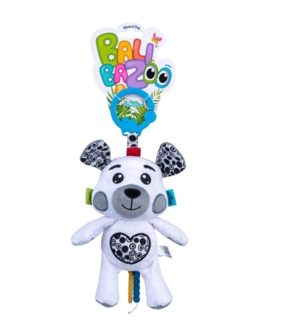 Psiak przyjaciel zadba o spokojny sen maluszka. Zdobią go kontrastowe wzory, które stymulują zmysł wzroku bobasa oraz kolorowe metki o zróżnicowanej fakturze. Doczepione do zabawki gryzaczki przyniosą ulgę obolałym dziąsełkom ząbkującego maleństwa. Piesek odtwarza piękną kołysankę, która ułatwi dziecku zasypianie, a praktyczna klamra pozwoli zająć mu wygodne miejsce w każdym dziecięcym łóżeczku czy wózku.
