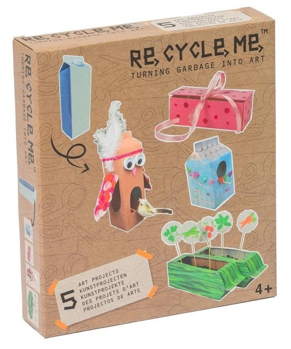 Wszystkie elementy znajdujące się wewnątrz opakowania, pokazane są z tyłu pudełka. Opakowania wykonane są z kartonu certyfikowanego FSC. Re-Cycle-Me wierzy w świat, w którym dzieci i ich rodzice stają się bardziej świadomi ilości śmieci, które produkujemy. Świat, w którym dzieci wykorzystując je ponownie zmniejszają ich ilość. Ten produkt jest przeznaczony dla dzieci tylko pod nadzorem rodziców. Ten produkt jest przeznaczony dla dzieci w wieku 4+.