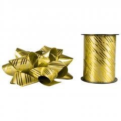 Zestaw do dekoracji prezentów wykonany z tworzywa sztucznego w kolorze złotym. W skład zestawu wchodzi rozeta oraz wstążka na szpuli. Produkt zdobiony jest złotymi, drobnymi paseczkami. Komplet do pełnej dekoracji opakowanego prezentu. Wymiary produktów: rozeta 10 cm, długość taśmy 100 cm.