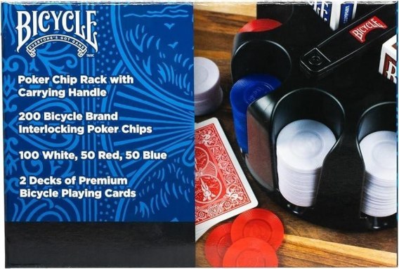 Zestaw 200 żetonów do pokera słynnej amerykańskiej marki Bicycle. Zestaw znany z bardzo wielu amerykańskich filmów i seriali!