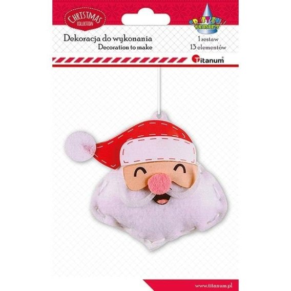 Zestaw do złożenia filcowa zawieszka głowa Mikołaja 11x11,5cm: 2 filcowe kształty, 8 filcowych naklejek, 1 włóknina, 1 mulina, 1 plastikowa igła 13 elementów