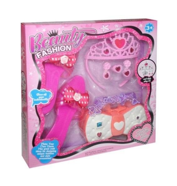 Zestaw bucików niczym z bajki "Kopciuszek", który zgubił swój pantofelek. Uzupełnienie zestawu stanowią tiara, kolczyki, pierścionek oraz torebka, która pomieści niejedne skarby. Produkt zapakowany w kartonowym opakowaniu z przezroczystym okienkiem. Zabawka dla dzieci od 3 lat. Podane wymiary stanowią wymiar opakowania.