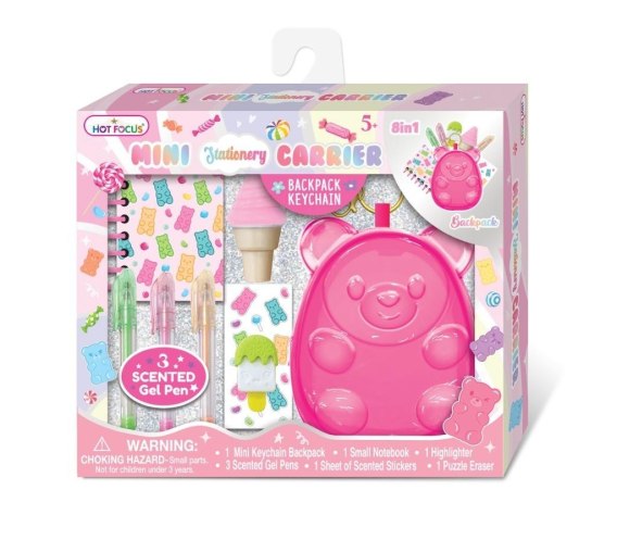 Ozdobny mini-plecaczek do schowania miniaturek najpotrzebniejszych akcesoriów! Plecaczek może być zawieszką, którą można zawiesić przy kluczach, plecaku czy torbie dzięki czemu można będzie go zabrać wszędzie ze sobą! Wiek: 5+. Zestaw zawiera: - mini-plecaczek zamykany na zamek - mini-notesik na spirali na zapiski - 3 żelowe mini-długopisy - gumka do mazania w zabawnym kształcie - 1 mini-zakreślacz - 1 arkusik naklejek
