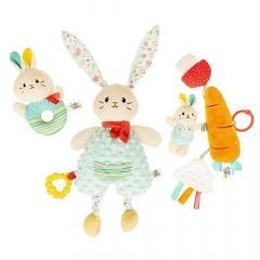 - w skład zestawu wchodzą 3 elementy: przytulanka Króliczek, zawieszka Marchewka oraz grzechotka Króliczek