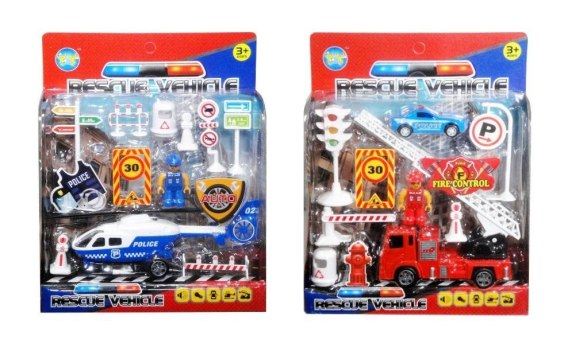Drogowy zestaw ratunkowy pomoże w niejednej akcji. W zestawie helikopter/wóz strażacki, znaki drogowe, a także policjant lub strażak. Pojazdy posiadają ruchome części, świecą i wydają dżwięki. Wybrane elementy zestawy działają na baterie typu AG13. Baterie znajdują się w zabawce. Zestaw dla dzieci od 3 lat. Podane wymiary sa wymiarami opakowania Produkt zapakowany w kartonową podstawkę z przezroczystym kloszem. Produkt występuje w kilku wersjach kolorystycznych, wybierany losowo. Cena d