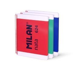 Zestaw 3 zeszytów notesów z metalową spiralą z zamknięciem w systemie coil-lock zapobiegającym zaczepianiu się o odzież lub zarysowaniom mebli. Papier A4 gładki, 80 kartek. Kolory: niebieski, zielony i różowy. Sztywna kartonowa okładka w dwóch różnych wykończeniach - błyszczącym i matowym. Wysokiej jakości papier o gramaturze 95 gr/m2, z mikroperforacją oraz z 4 otworami. Rozcięcie przy perforacji ułatwiające rozdzielenie każdego arkusza. Kolekcja MILAN nata(R) 624 inspirowana jest oryginalną kolorystyką i designem gumek MILAN produkowanych w Hiszpanii od 1918 roku.