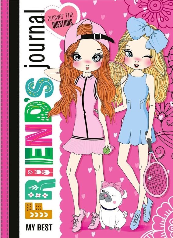 My Best Friend's journal - answer the questions. Ozdobny zeszyt w twardej oprawie z brokatem. Jest to rodzaj pamiętnika typu "złote myśli", gdzie znajdują się miejsca na wpisy 23 dziewczynek (przyjaciółek/koleżanek właścicielki). Jednakże pierwszy wpis należy do posiadaczki zeszytu. Każdy z wpisów zawiera pytania dotyczące między innymi danych personalnych, szkoły, zainteresowań, czy też marzeń. Wpisy zakończone są kolorowankami. Doskonała pomoc w nauce języka angielskiego.