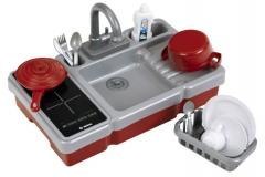 Klein 7110 Mini kuchnia Bosch z funkcja lania wody. Ta kuchnia zmieści się nawet w najmniejszym pokoju dziecięcym! Oferuje wszystko, czego potrzebują mamy lalek i tatusie pluszowych misiów, aby opiekować się swoimi bliskimi. Wystarczy postawić garnek na płycie grzewczej, a efekty świetlne i dźwiękowe poinformują Cię, że cos się gotuje i skwierczy. Następnie ułóż wszystko na talerzach, połóż obok sztućce i nakarm lalki i misie. Czy wszyscy się najedli? Czas posprzątać ze stołu, włożyć naczynia do zlewu i napompować go wodą, aby rozpocząć zmywanie. Po umyciu naczynia trafiają do kosza, aby je osuszyć, podczas gdy świeże powietrze wszystko osusza, Twoje maluchy mają czas na nowe, pomysłowe zabawy. Mini kuchnia w popularnym designie Bosch zawiera kran z funkcją pompy wodnej, płytę grzewczą z oświetleniem i dźwiękiem oraz wiele akcesoriów: komplet garnków, naczyń, sztućców i ociekacz. Przygotowywanie i serwowanie jedzenia, zmywanie naczyń i sprzątanie rozwijają kreatywność i sprawność motoryczną dzieci zwłaszcza gdy wszystko odbywa się w tak zabawny i pomysłowy sposób Specyfikacja : Wymiary: 42 cm x 26 cm x 26 cm Odpowiedni dla dzieci w wieku 3 lat i starszych Wymagane baterie: 3 x R6-AA - brak w zestawie